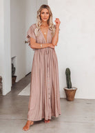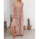 تقدم هذه الفستان الطويل الانسيابي مظهرًا أنيقًا ومريحًا. يبرز تصميمه ذو العنق العميق القوام. مثالي للأيام المشمسة أو الأمسيات الصيفية.