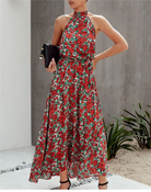 هذا الفستان الطويل بأسلوب بوهيمي أنيق يقدم أنماطًا زهرية وقصة انسيابية. يبرز ياقة العالية مع إغلاق خلفي الكتفين برقة.