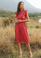 تجذب هذه الفستان الطويل البوهيمي الأنيق بلونها الأحمر النابض وقصتها السائلة. أسلوبها الأنيق والمريح يبرز القوام بخفة. مثالية للأيام المشمسة وكذلك للأمسيات الصيفية.