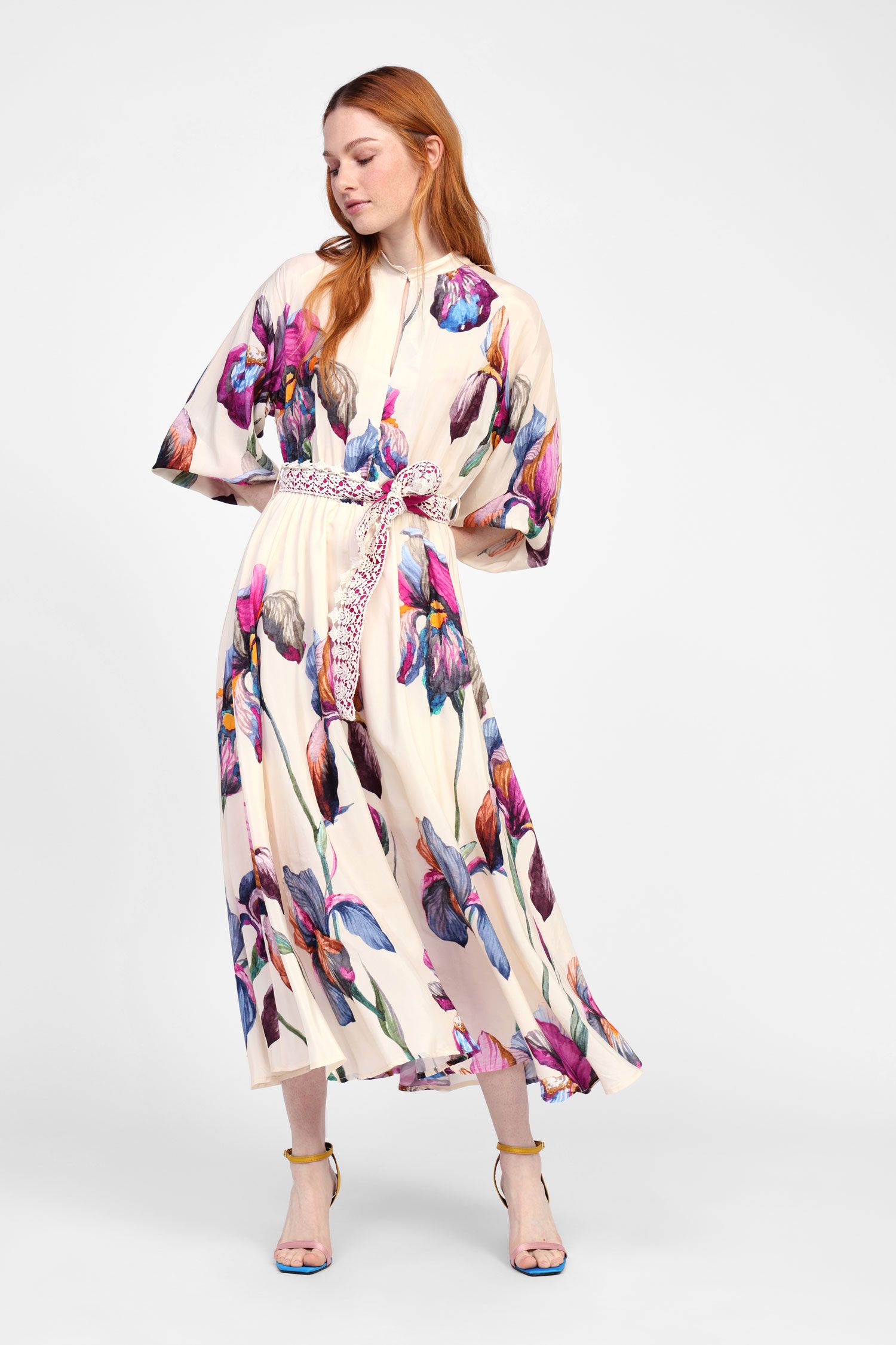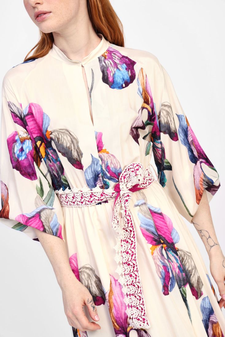 يقدم هذا الفستان الطويل شكلًا انسيابيًا يتميز بحزام من الكروشيه الرقيق. تضيف طباعته الزهرية لمسة من الانتعاش والأنوثة. مثالي للمناسبات، العطلات أو أمسية مع الأصدقاء.