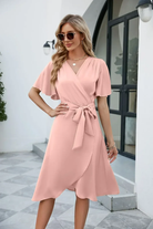 Tyto zavinovací šaty okouzlují svým lichotivým střihem a opaskem na zavázání, který zvýrazňuje pas. Jejich lehké rukávy a volný střih jim dodávají ženský a přirozený vzhled. Ideální pro slunečné dny i na elegantní večerní výlet.