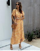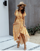 Αυτή η μακριά φόρεμα με κομψό στυλ είναι ιδανική για γάμους σε χωριά ή για υπαίθριες γιορτές. Η φαρδιά της γραμμή, το V ντεκολτέ και η λεπτή ζώνη αναδεικνύουν κομψά τη σιλουέτα. Τα λουλουδάτα σχέδια και το κίτρινο χρώμα προσθέτουν μια ανοιξιάτικη και φωτεινή αίσθηση.