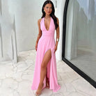 Αυτό το μακρύ φόρεμα διαθέτει βαθύ ντεκολτέ και ψηλή μέση, αναδεικνύοντας τη σιλουέτα σας. Η τολμηρή σχισμή και η λεπτή δέσμευση προσθέτουν μία πινελιά κομψότητας. Ιδανικό για κομψές βραδιές και ειδικές περιστάσεις.
