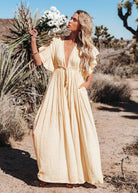 Αυτή η μακριά ρευστή φόρεμα προσφέρει μια άνετη και ελαφριά γραμμή. Η βαθιά λαιμόκοψη αναδεικνύει τη σιλουέτα. Ιδανική για καλοκαιρινές ημέρες ή κομψές βραδιές.