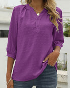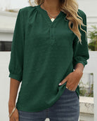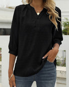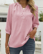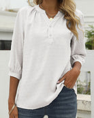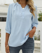 Esta blusa clásica combina un corte atemporal con un toque moderno. Su cuello abierto con botones aporta estilo, mientras que las mangas ligeramente fruncidas añaden un toque femenino. Perfecta para un look cuidado y cómodo cada día.