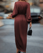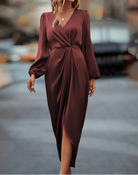 Tämä pitkähihaisten midi-tyylinen ristiin menevä mekko hurmaa hillityllä eleganssillaan ja imartelevalla leikkauksellaan. Sen tyylikäs muotoilu ja istuva siluetti tekevät siitä täydellisen vaatteen niin toimistoon kuin kaupunkireissuille. Täydellinen tasapaino mukavuuden ja hienostuneisuuden välillä.