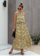 Cette robe longue bohème séduit par son imprimé floral éclatant et son lien raffiné à nouer autour du cou. Sa coupe fluide met subtilement la silhouette en valeur tout en offrant un confort idéal pour les journées chaudes. Parfaite pour une escapade estivale ou une balade en ville.