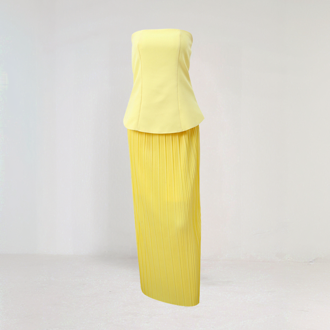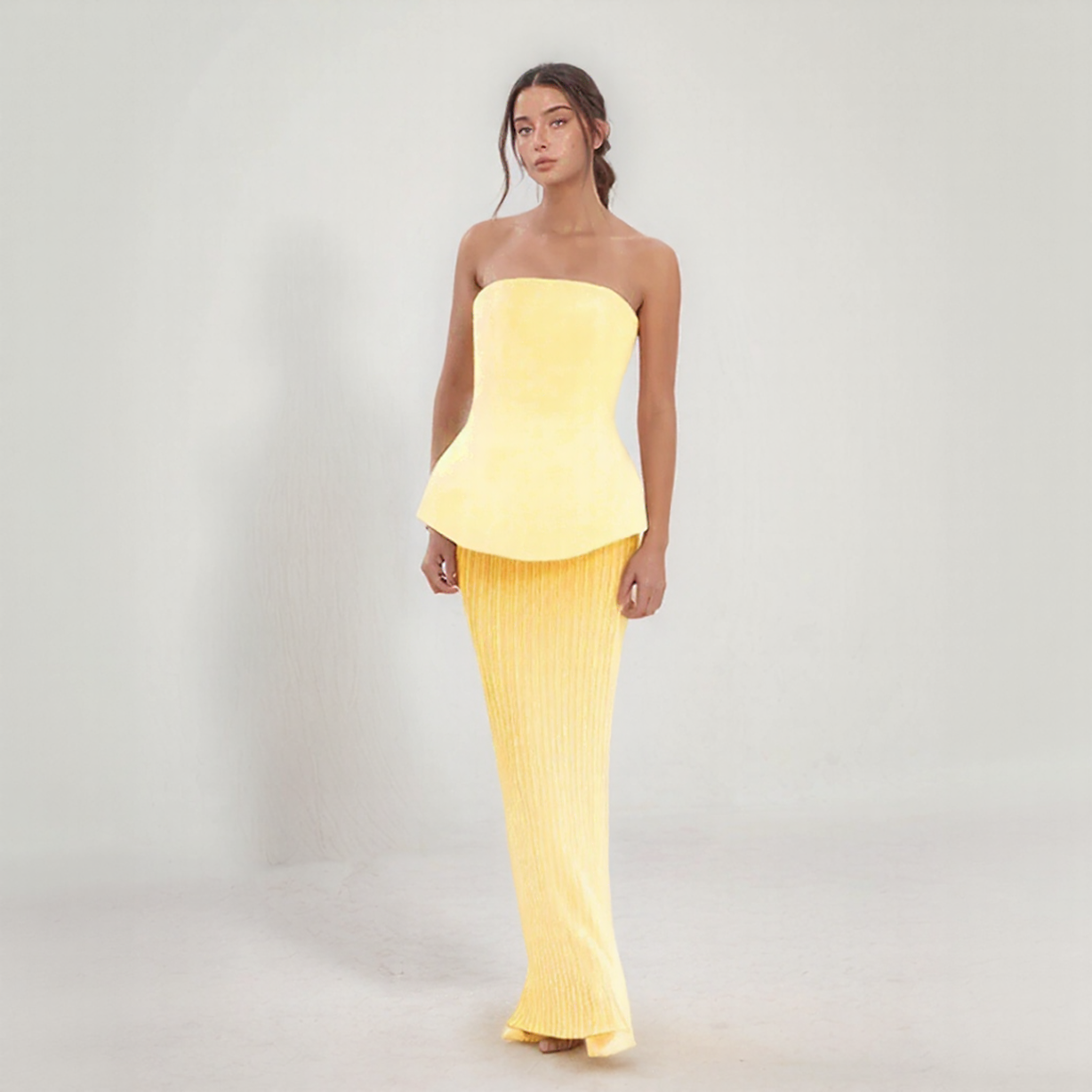 הסט הזה משלב טופ קצר ללא רצועות שמדגיש את הכתפיים עם חצאית ארוכה מקופלת שנופלת בצורה זורמת. מושלם לאירועים אלגנטיים, הוא משלב בין אלגנטיות מודרנית לנוחות לאורך כל היום.