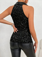 Ez a ujjatlan felső az elegancia és a finom ragyogás tökéletes egyensúlyát kínálja az estélyi öltözékekhez. A hajtókás gallér kifinomult érintést ad, míg a csillogó hatás egy csillagos égboltra emlékeztet. A derékban szabott fazon stílusosan kiemeli a sziluettet. Tökéletes ahhoz, hogy magabiztosan ragyogjon elegáns eseményeken.