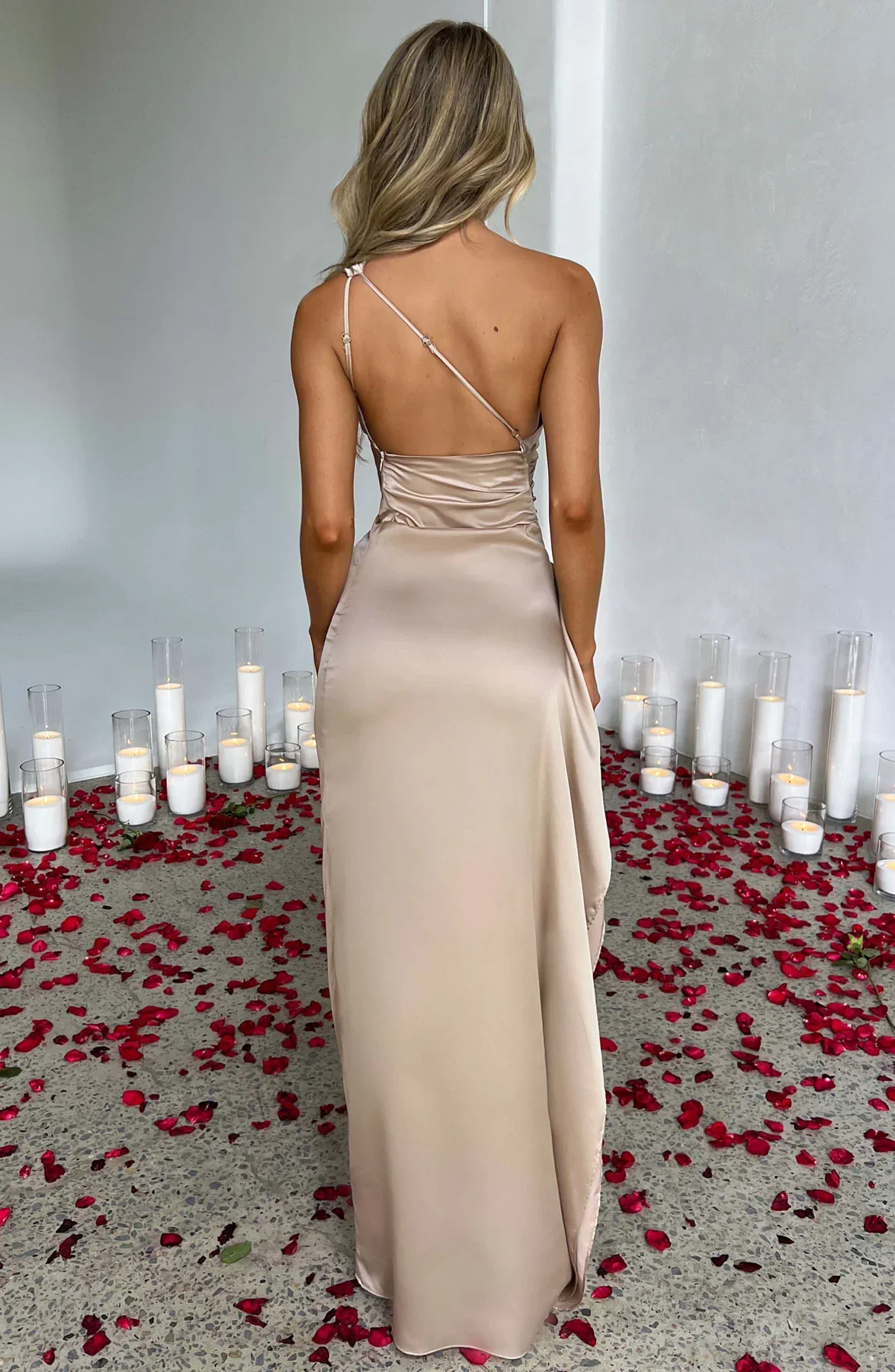 Ez a hosszú, aszimmetrikus dizájnú ruha egy oldalsó hasítékkal van kiemelve. Elegáns és kényelmes szabása ideálissá teszi estélyekre és elegáns eseményekre.