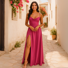 Ez a ujjatlan hosszú ruha a nőiességet testesíti meg kifinomultsággal. A szabása kiemeli a vállakat, míg a folyékony, hasított szoknya minden mozdulatot eleganciával kísér. Puha tapintású és kényelmes viselet, alkalmas elegáns estékre és laza pillanatokra egyaránt.