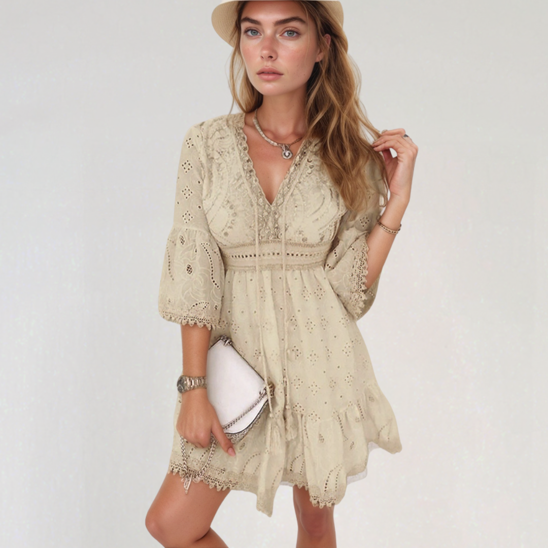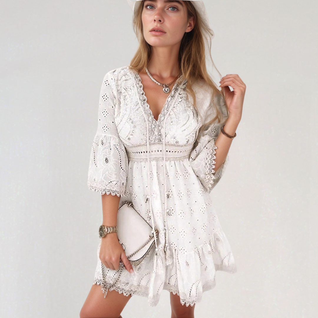 Ghislaine | Abito Corto Bohemien – Ricami Delicati e Collo a V