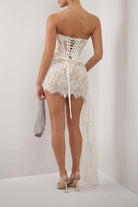 このショートドレスは、大胆なフィットカットでシルエットを引き立てます。ノースリーブのデザインとレースアップの背中が、独特のキャラクターを与えます。自信を持って目立ちたい夜のイベントや特別な場に最適です。