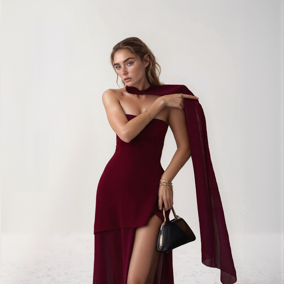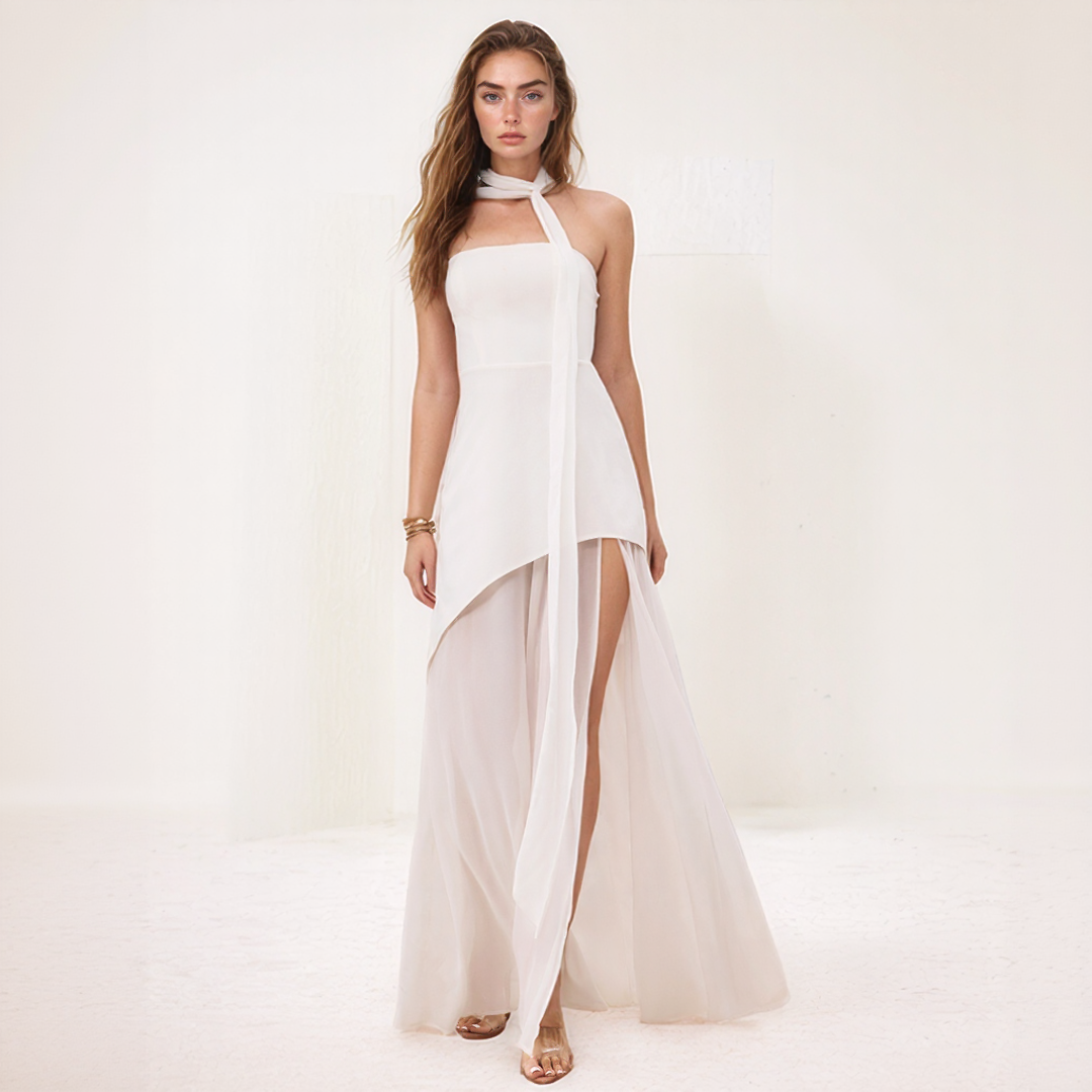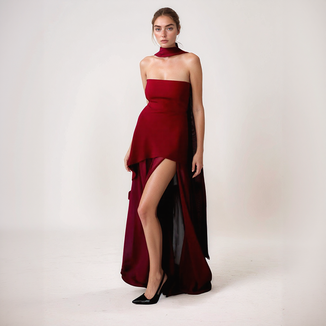 ネリー | エレガントなロングドレス – アシンメトリックカットと統合されたスカーフ