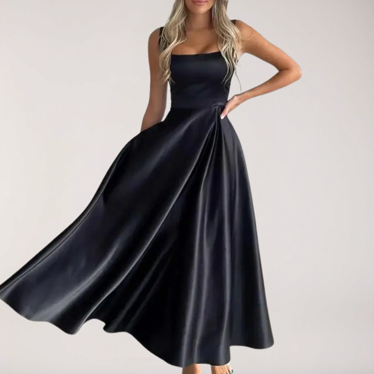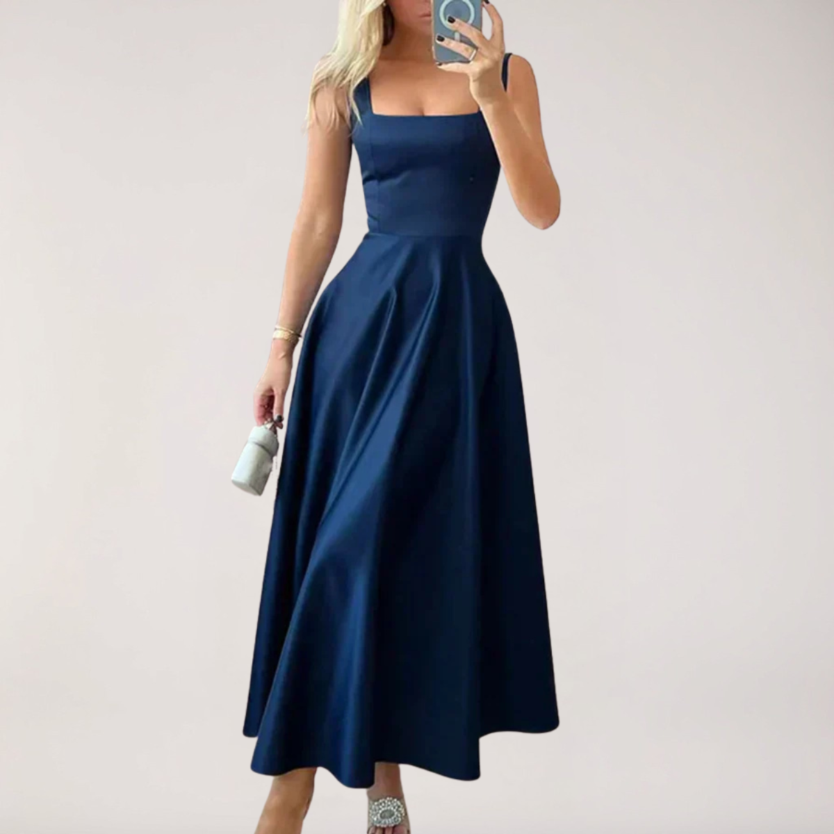 Denne midikjolen har en strukturert silhuett med en flatterende firkantet hals. Dens flytende A-line snitt gir en raffinert eleganse for formelle arrangementer.