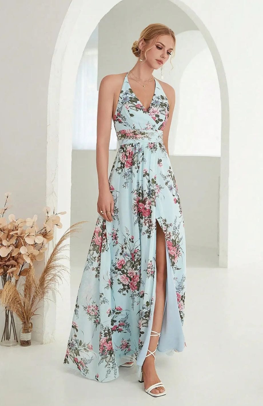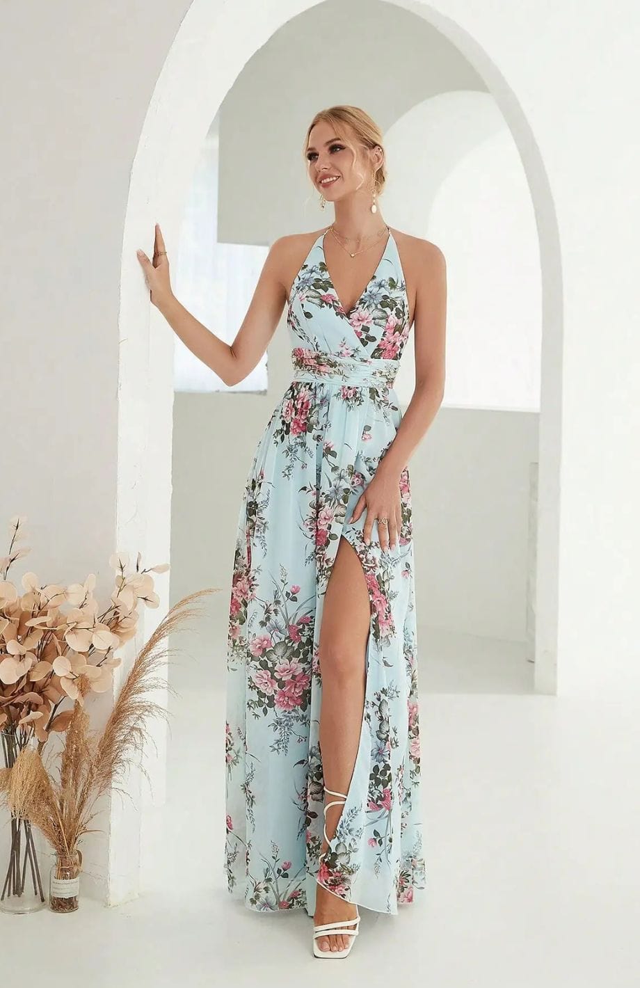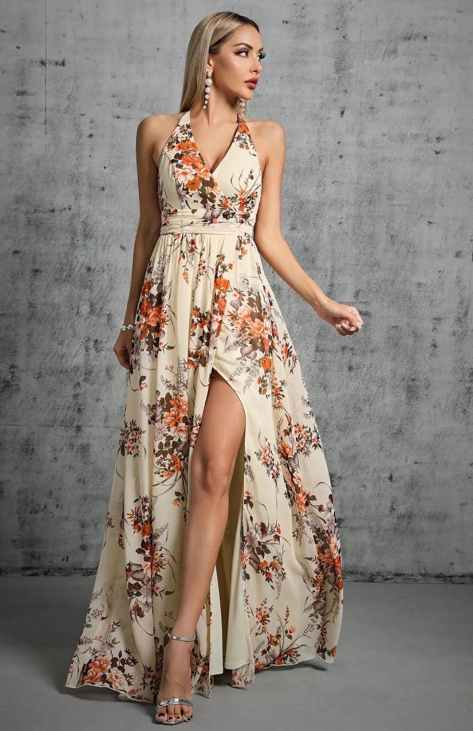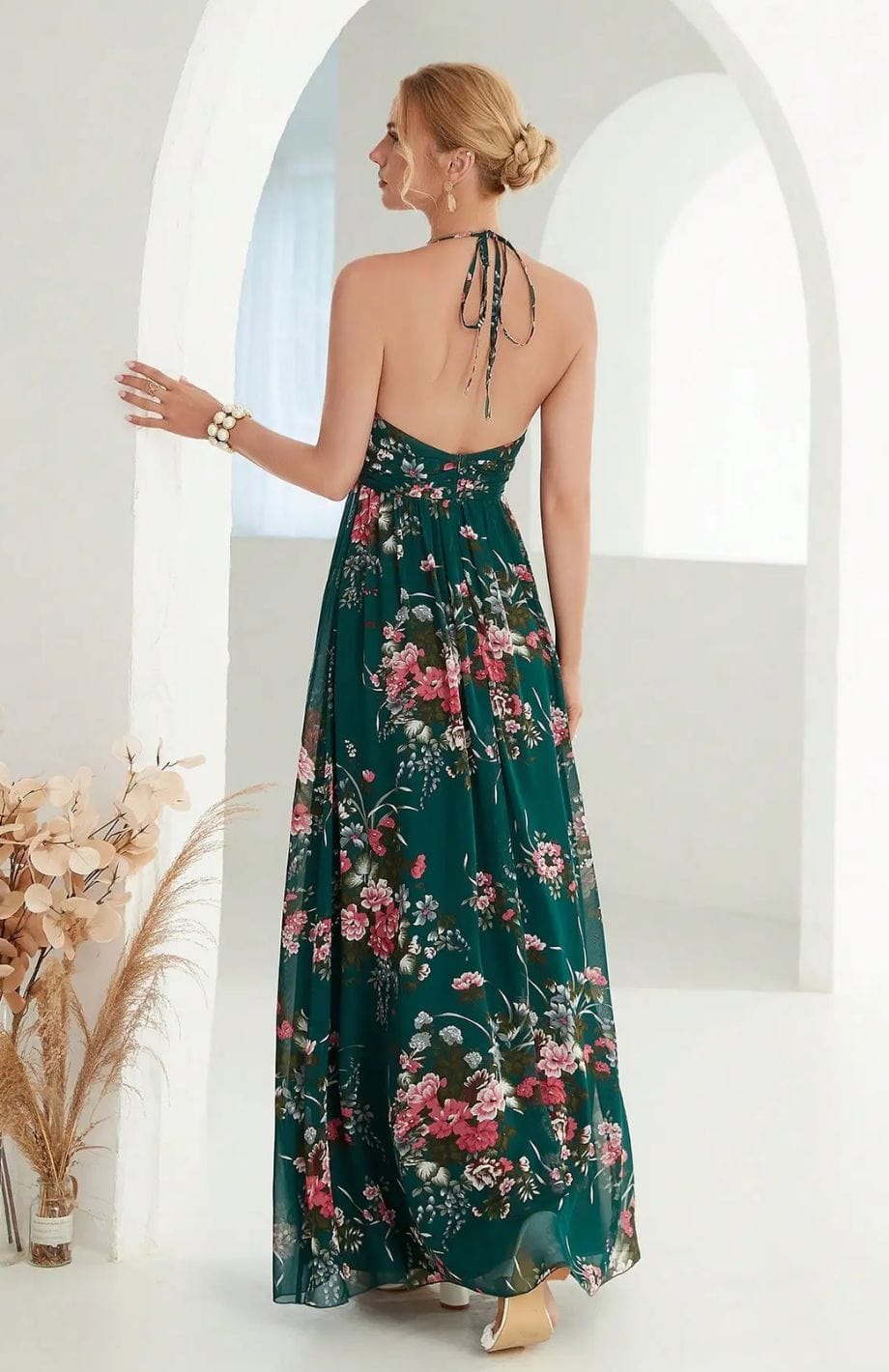 Ta długa i zwiewna sukienka jest idealna na wiejskie wesela. Jej dekolt w kształcie litery V i taliowane wykończenie podkreślają sylwetkę. Krótkie, falbaniaste rękawy dodają lekkości.