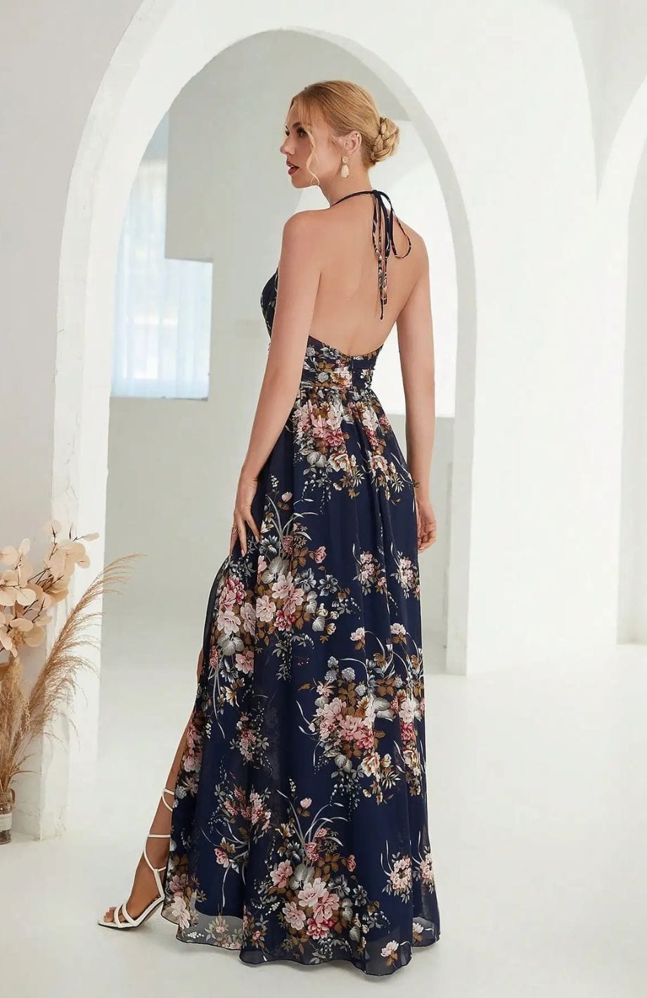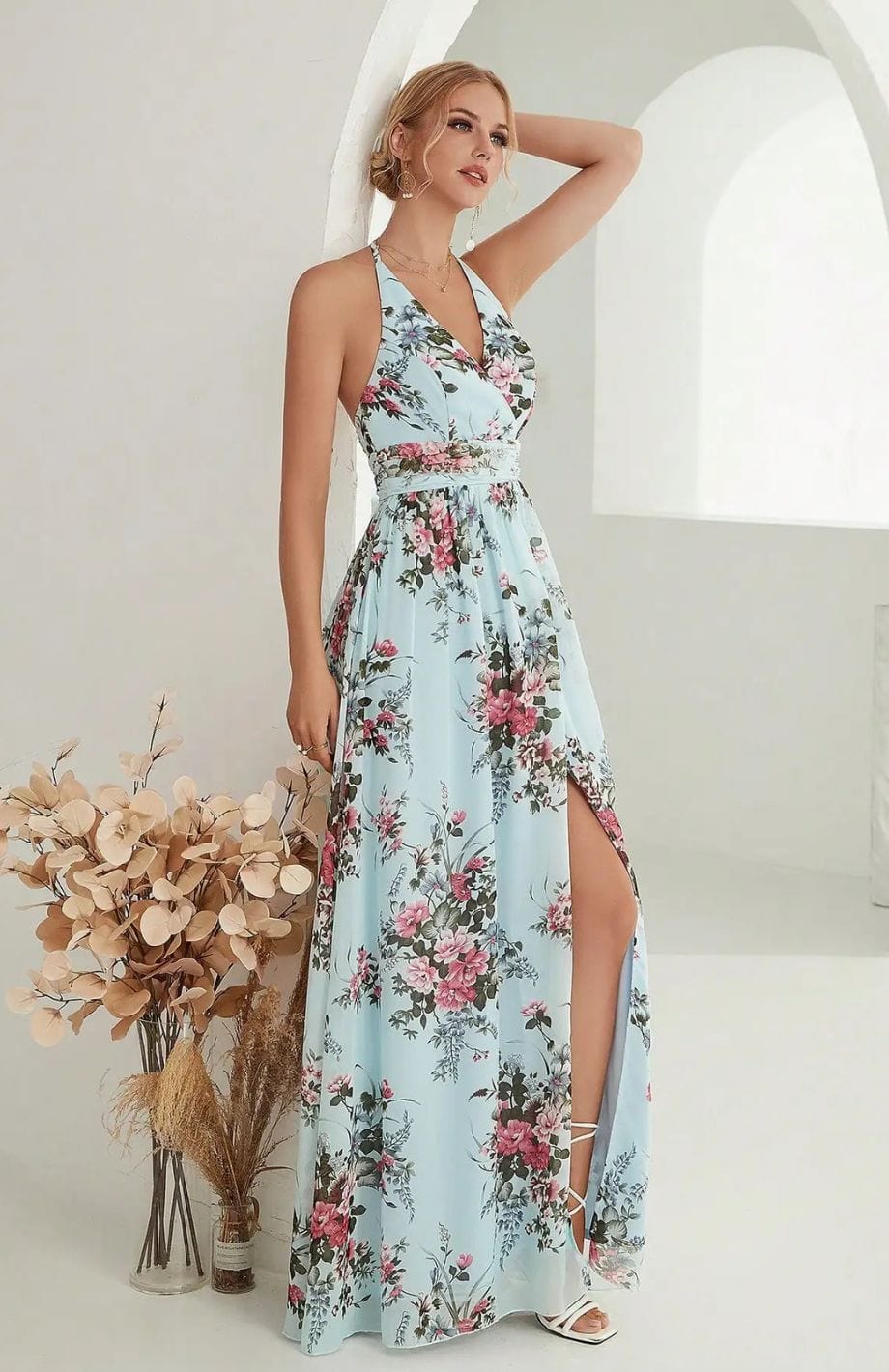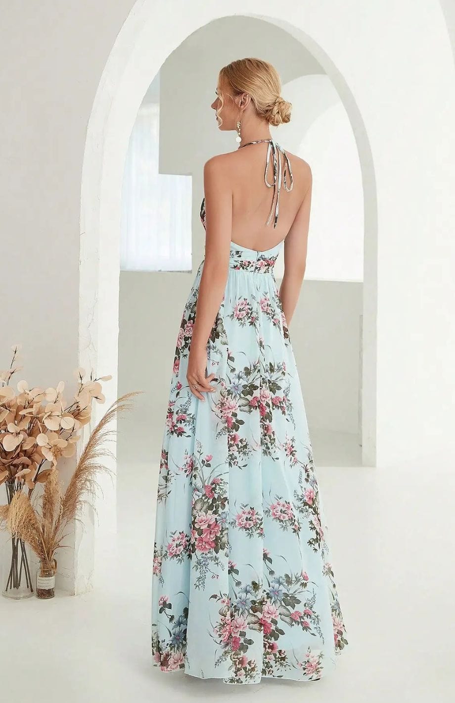 Ta długa i zwiewna sukienka jest idealna na wiejskie wesela. Jej dekolt w kształcie litery V i taliowane wykończenie podkreślają sylwetkę. Krótkie, falbaniaste rękawy dodają lekkości.