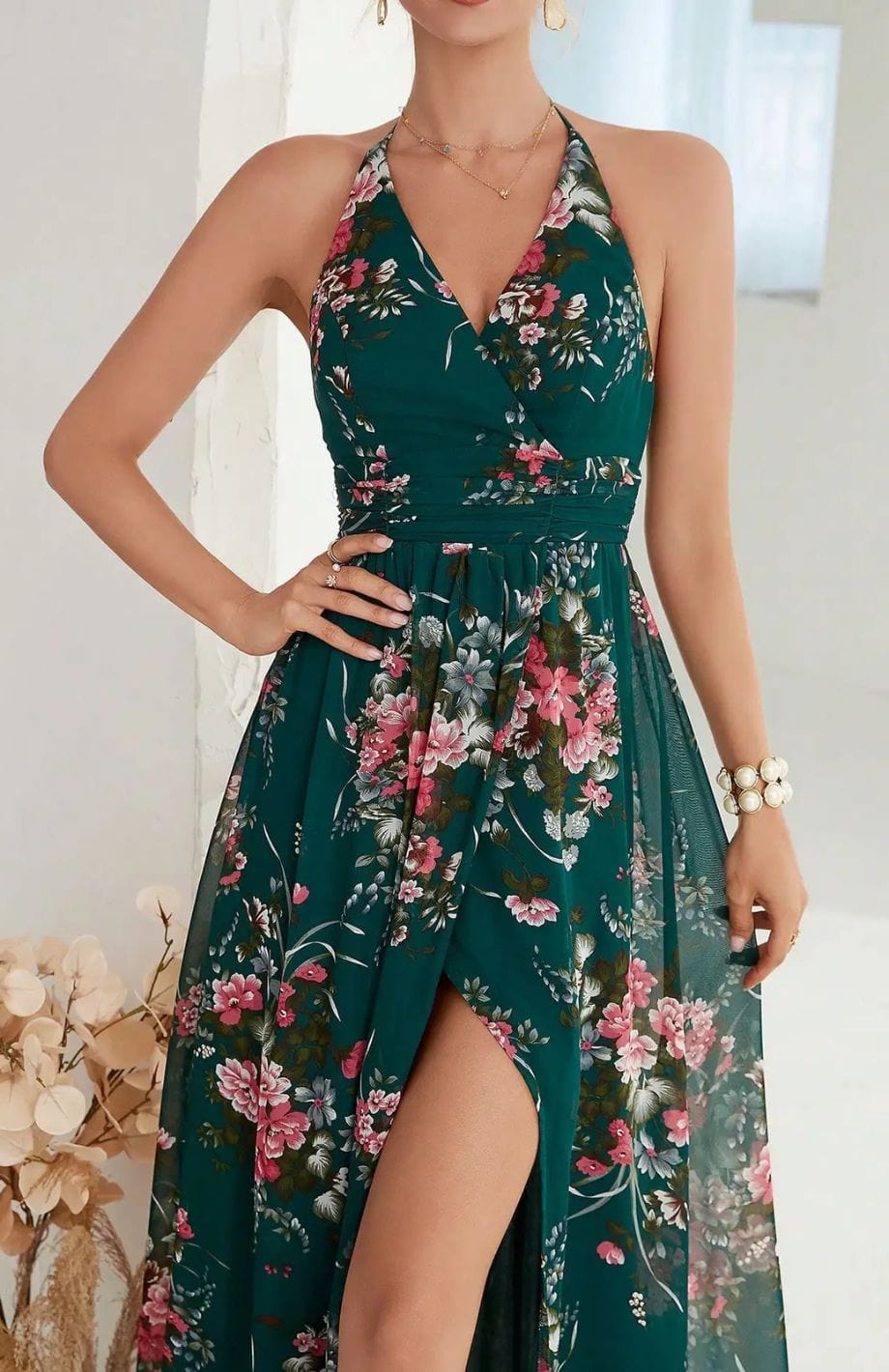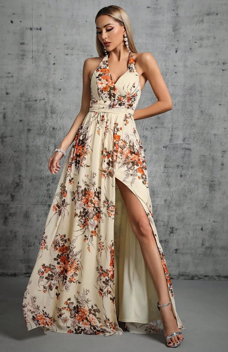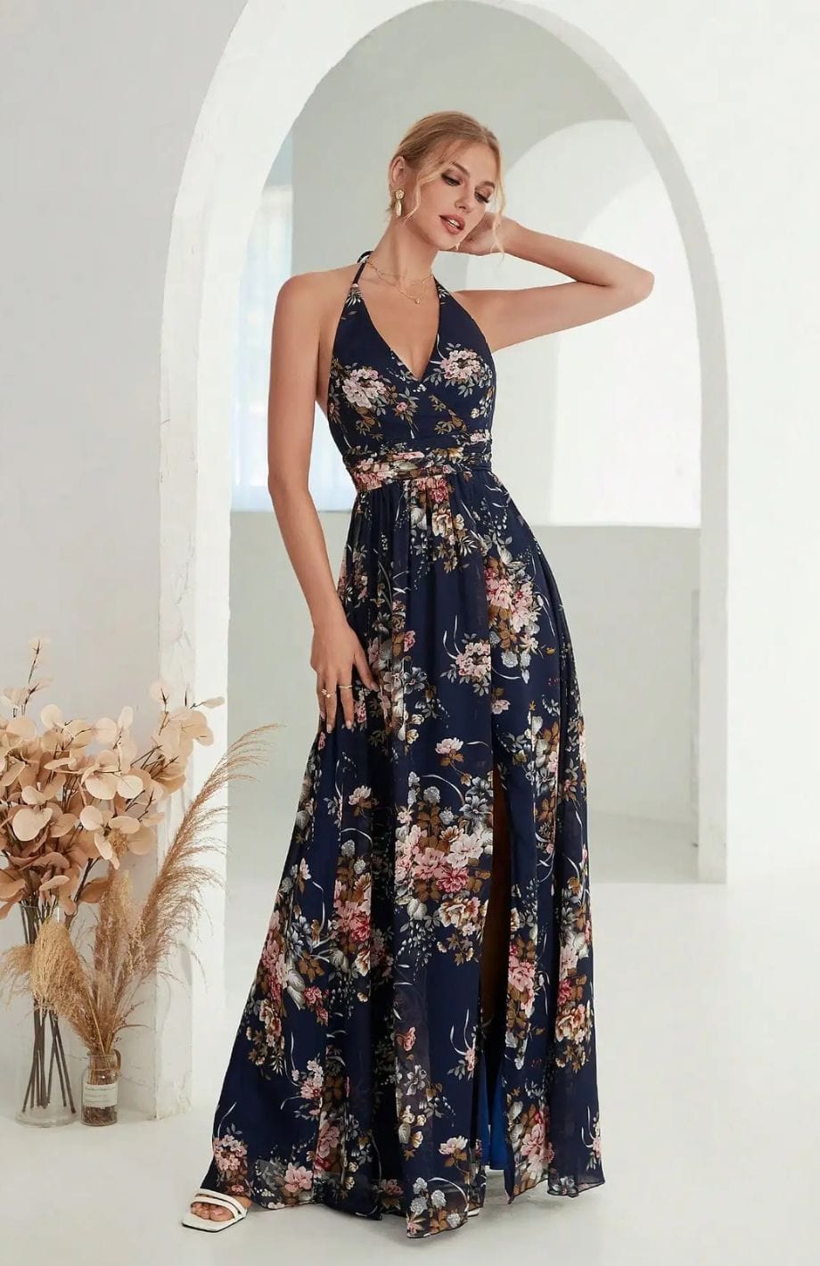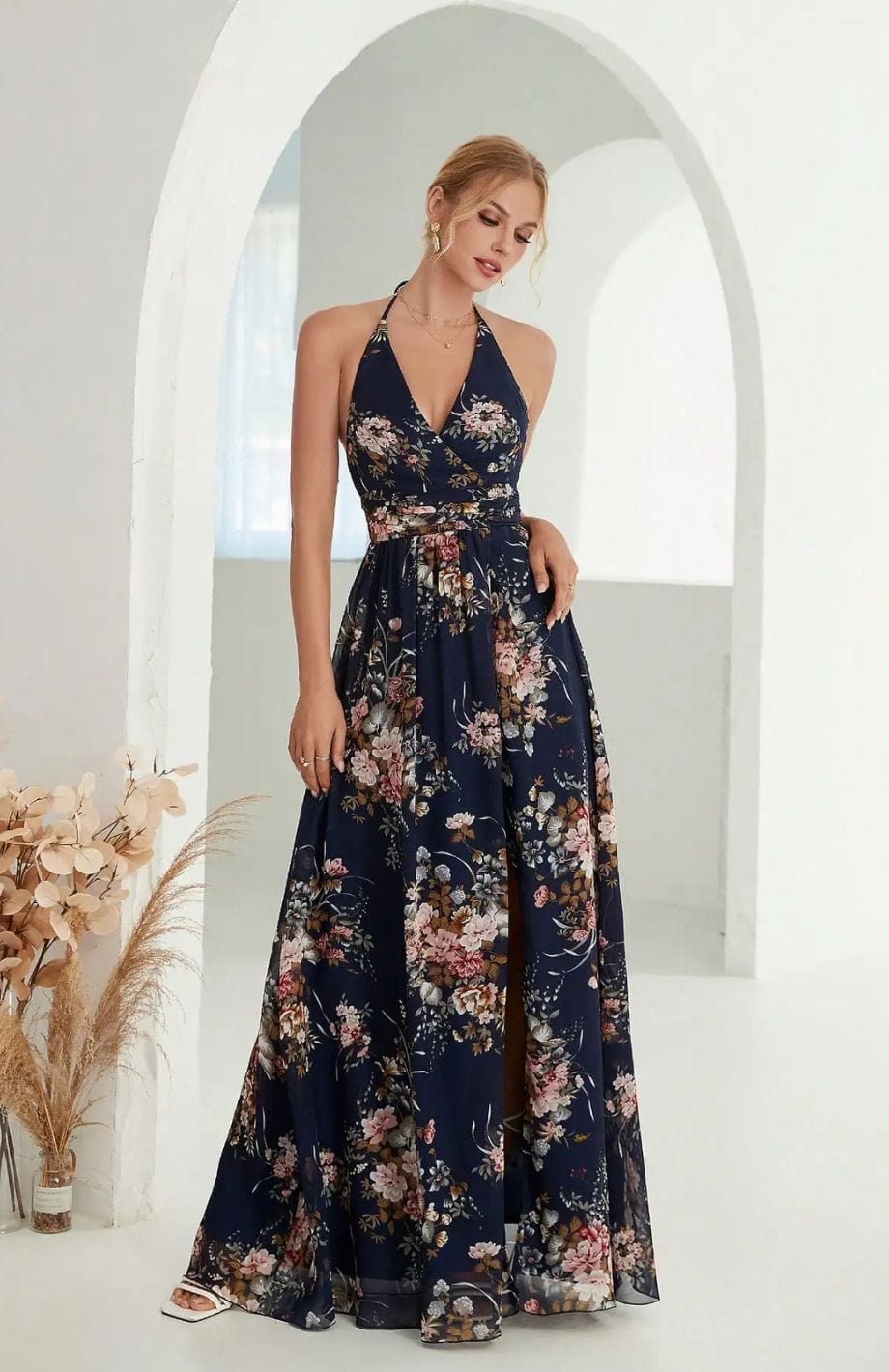 Ta długa i zwiewna sukienka jest idealna na wiejskie wesela. Jej dekolt w kształcie litery V i taliowane wykończenie podkreślają sylwetkę. Krótkie, falbaniaste rękawy dodają lekkości.