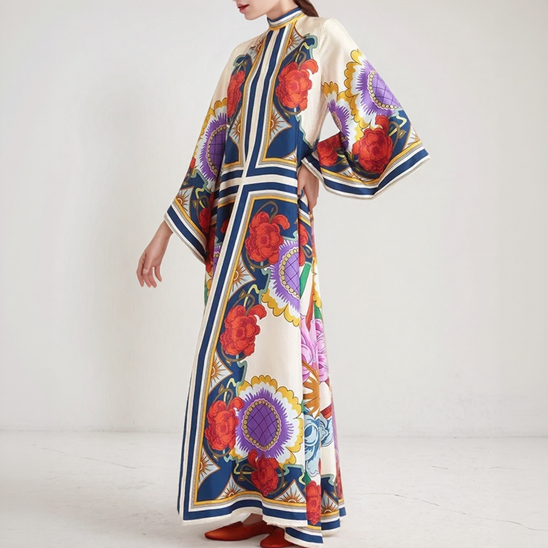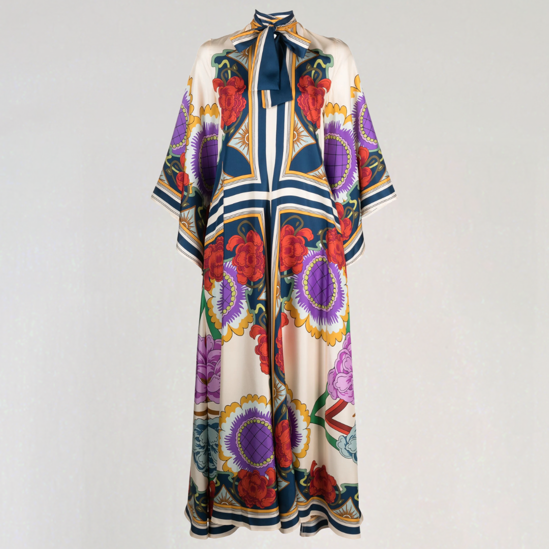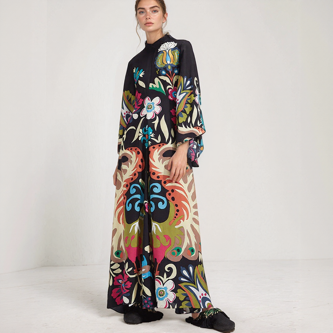 Această rochie lungă prezintă motive florale îndrăznețe și o croială fluidă. Gulerul său înalt cu detaliu de fundă la spate adaugă o notă sofisticată. Perfectă pentru toate anotimpurile, oferă o eleganță boemă atemporală.