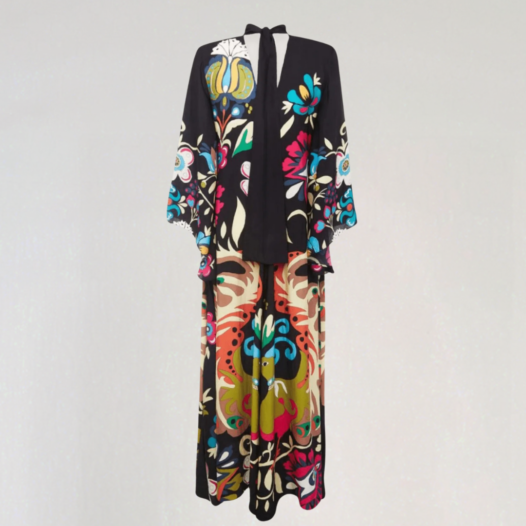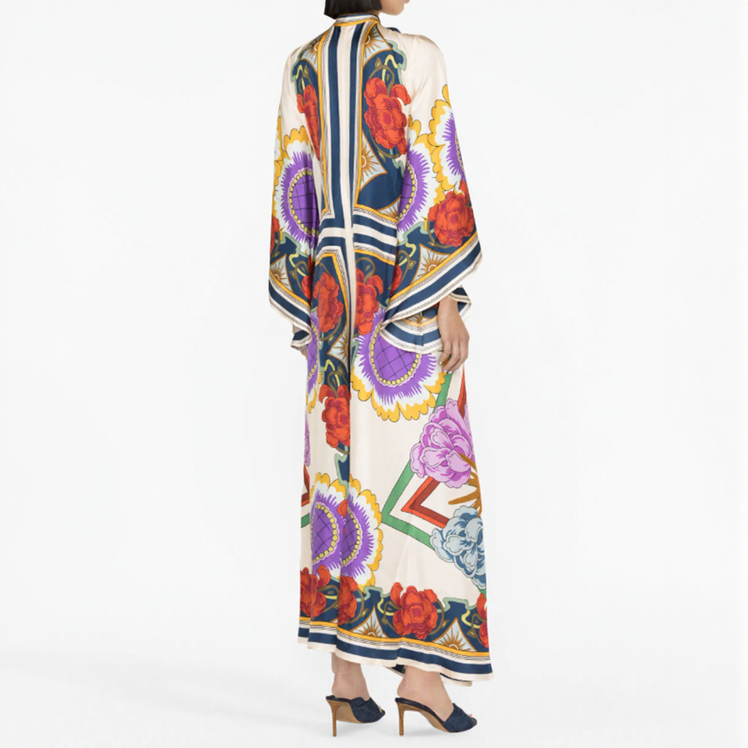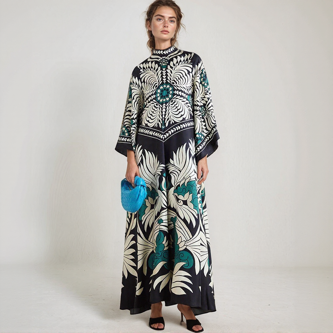 Această rochie lungă prezintă motive florale îndrăznețe și o croială fluidă. Gulerul său înalt cu detaliu de fundă la spate adaugă o notă sofisticată. Perfectă pentru toate anotimpurile, oferă o eleganță boemă atemporală.