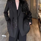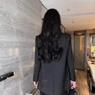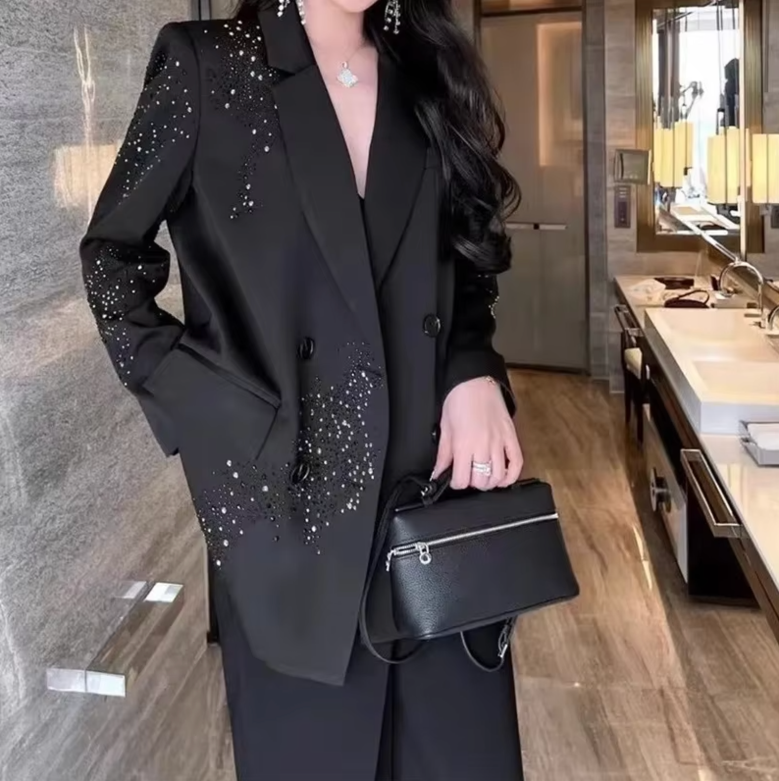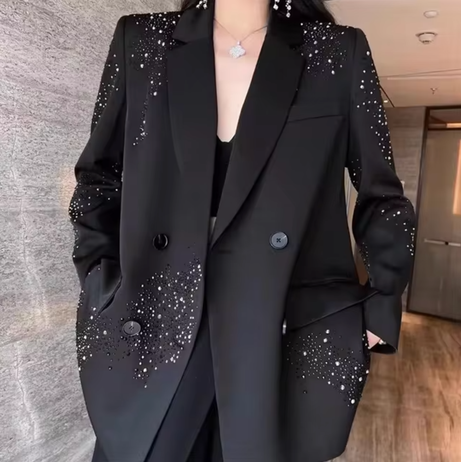Táto čierna bunda stelesňuje modernú eleganciu s nádychom jemného lesku. Jej trblietavé detaily pridávajú rafinovaný nádych vašej postave, bez toho, aby to prehnali. Ideálna na štýlový večer alebo na výnimočný profesionálny vzhľad, spája striedmosť a žiaru.